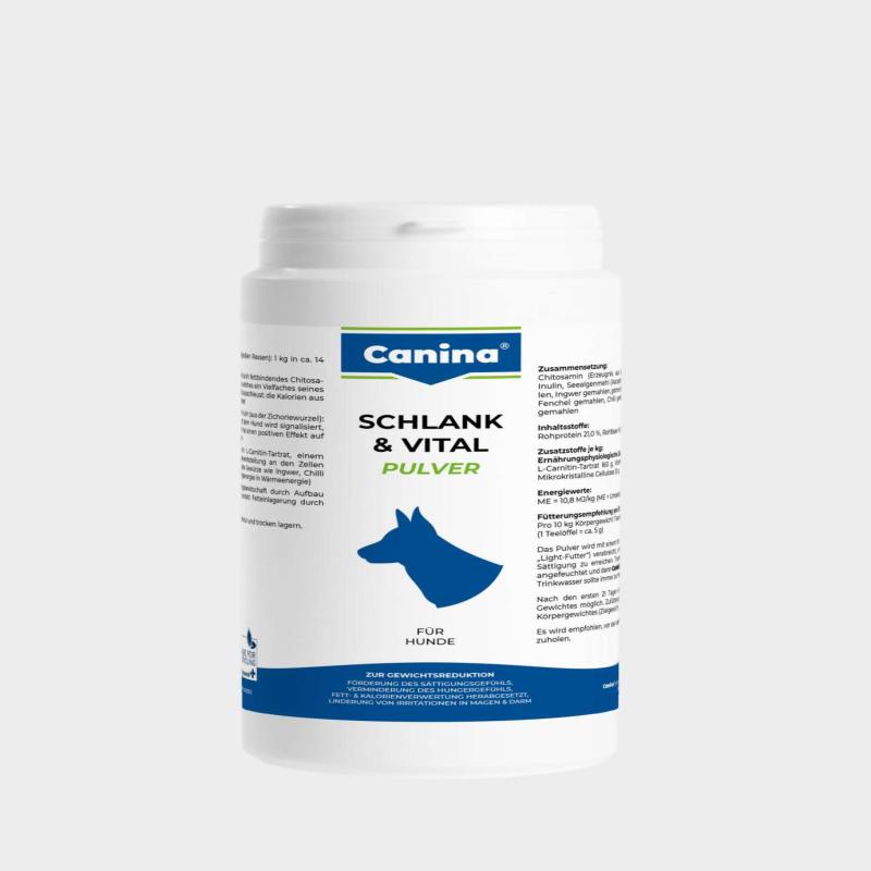 Canina® SLIM & VITAL është një suplement dietetik për qen, i krijuar për të ndihmuar në reduktimin e peshës së tepërt në mënyrë të kontrolluar dhe të sigurt. Në varësi të madhësisë së qenit dhe regjimit ushqimor, mund të arrihet një ulje peshe rreth 1 kg për afërsisht 14 ditë (p.sh. tek racat me madhësi mesatare).